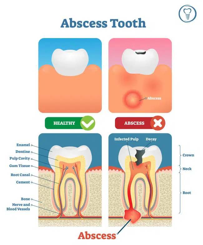 If the infected nerve is not treated, the infection will build up at the bottom of the tooth and cause the abscess. The infection can begin to spread to other parts of your mouth like gums, bone, and other teeth.
